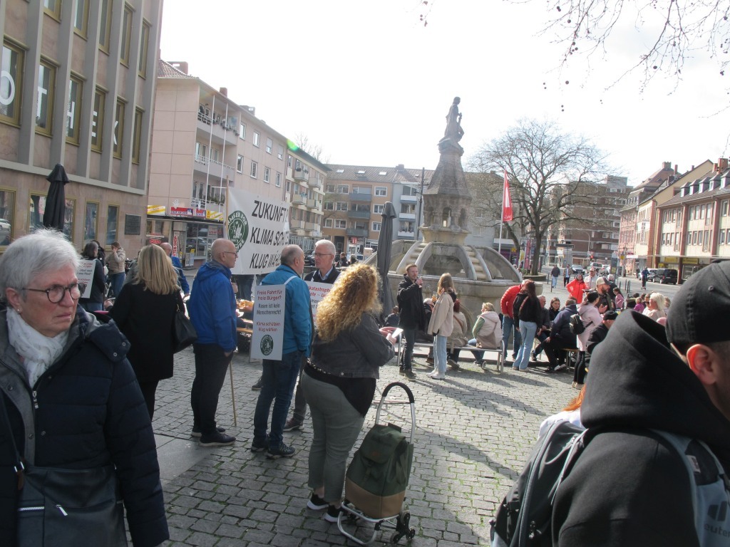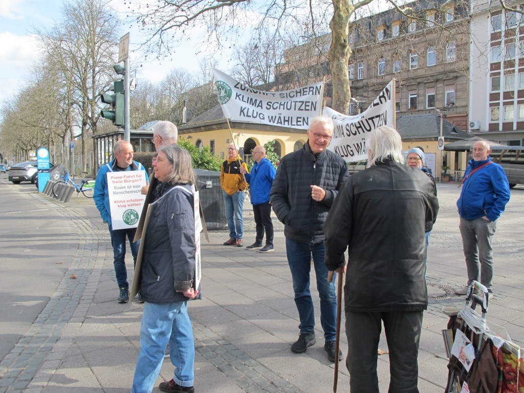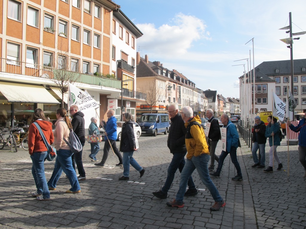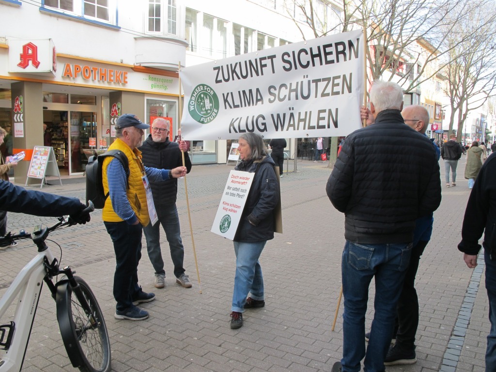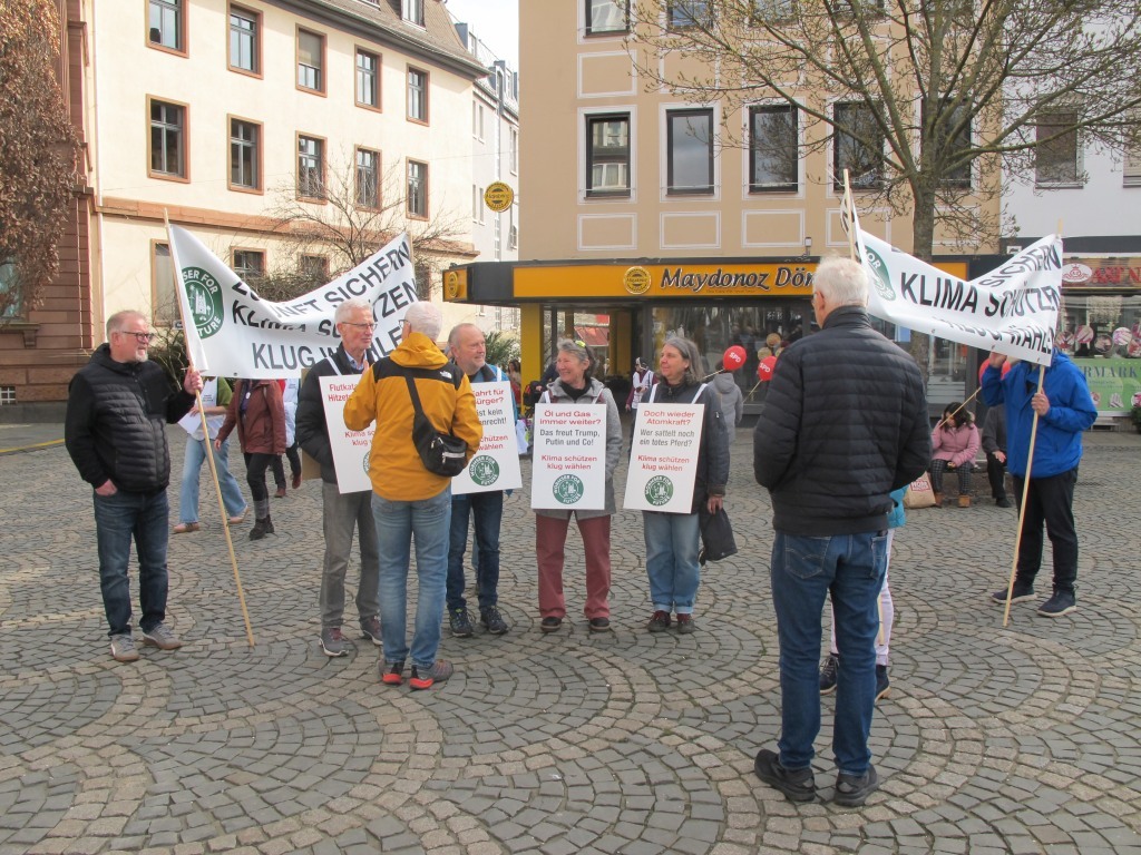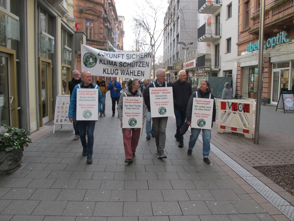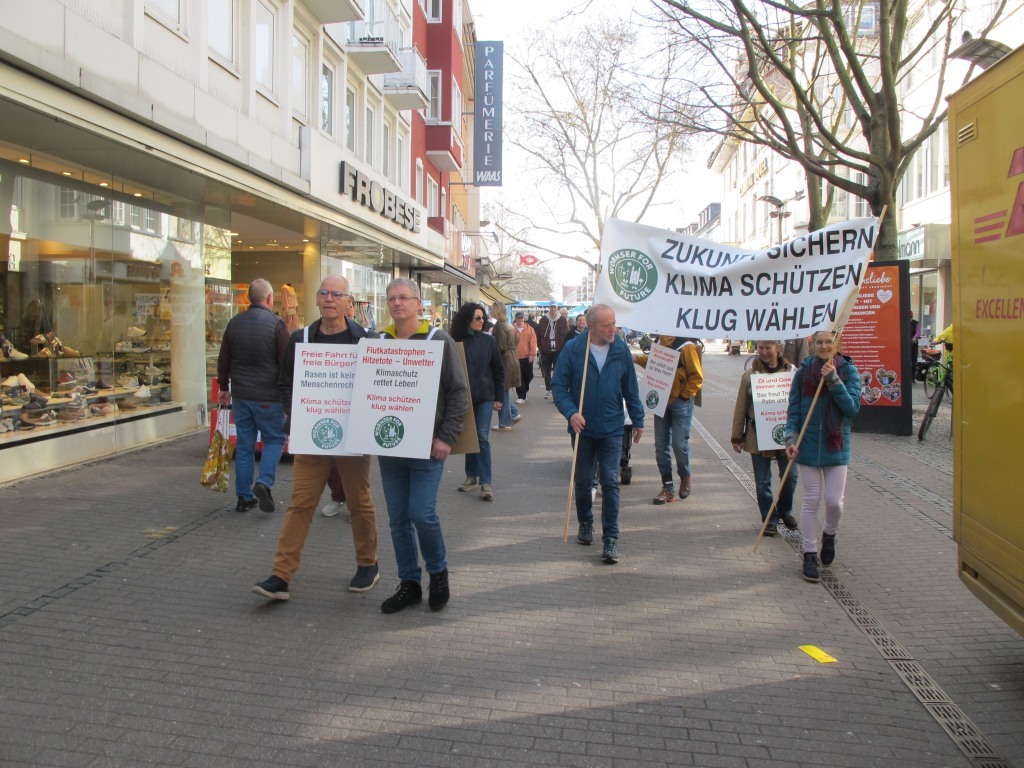 Neun Aktive unserere Klimainitiative zogen mit zwei Bannern vom Hauptbahnhof durch die KW an die Kreuzung am Parma Platz und weiter durch die Fußgängerzone zur Kreuzung am Marktplatz.