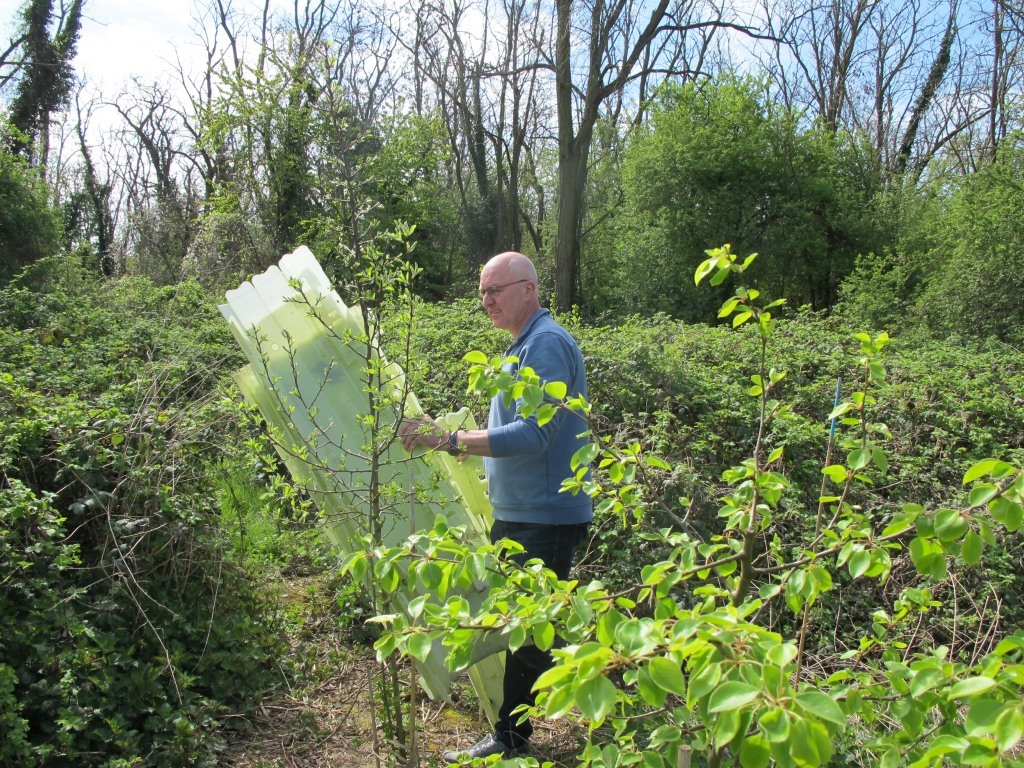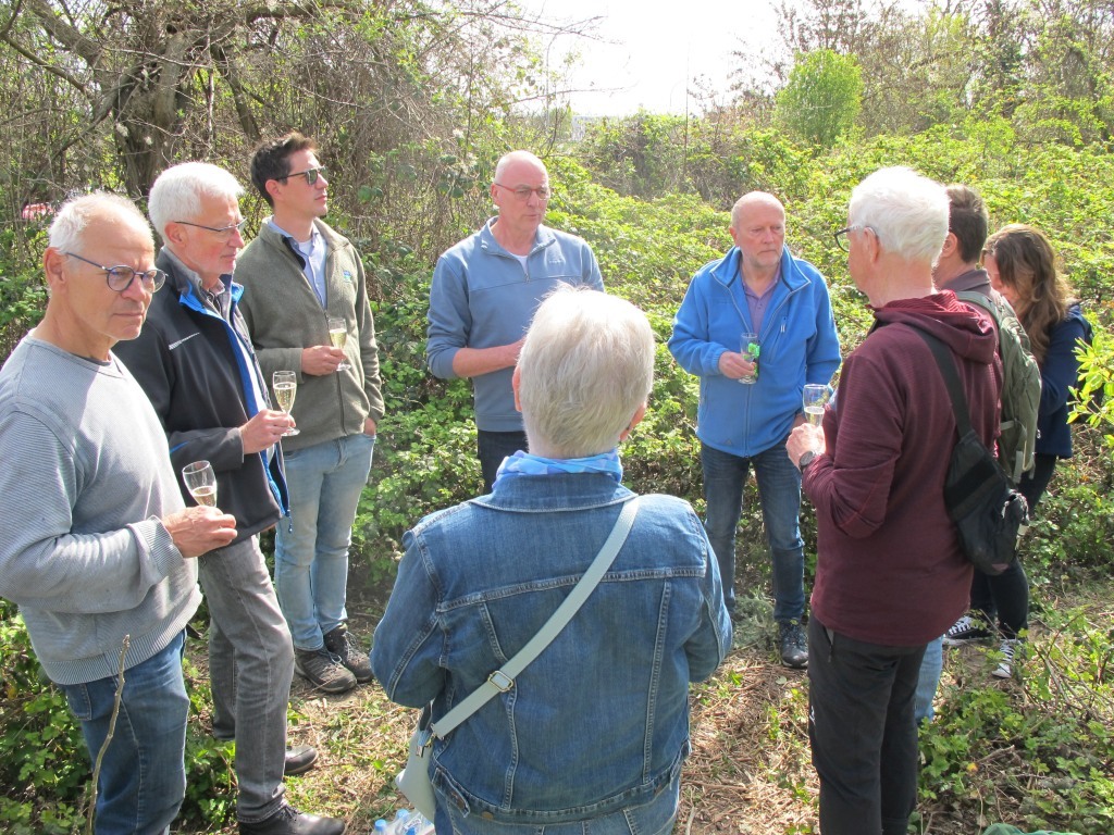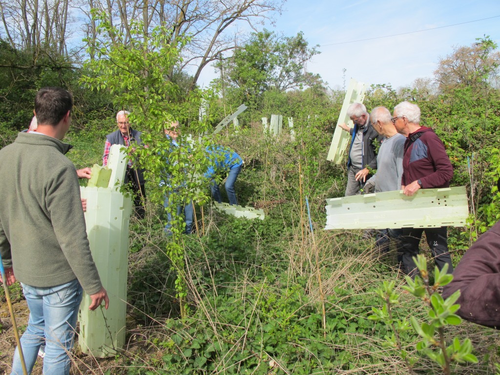 Um 11.00 Uhr wurde danach am Kirschgartenweg letzte Hand angelegt. Die Schutzhüllen um die Pflanzlinge konnten entfernt werden. Die Anwesenden waren sich einig, dass das Projekt als rundweg gelungen bezeichnet werden kann. Besonderer Dank galt Stefan Born, der den Anstoß für das Waldinselprojekt gegeben hatte und seit zwei Jahren die Pflege der Baumhaufen mit WfF-Aktiven organisiert sowie immer wieder selbst mitgearbeitet hat. Auch die Verdienste von Nicolai Kalinke wurden betont. Er schaffte als Landesgeschäftsführer der SDW die nötigen finanziellen und materiellen Voraussetzungen zur Durchführung der Projekte.