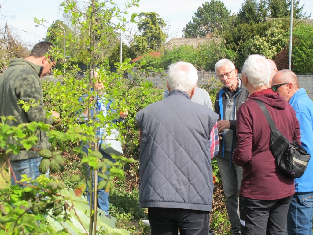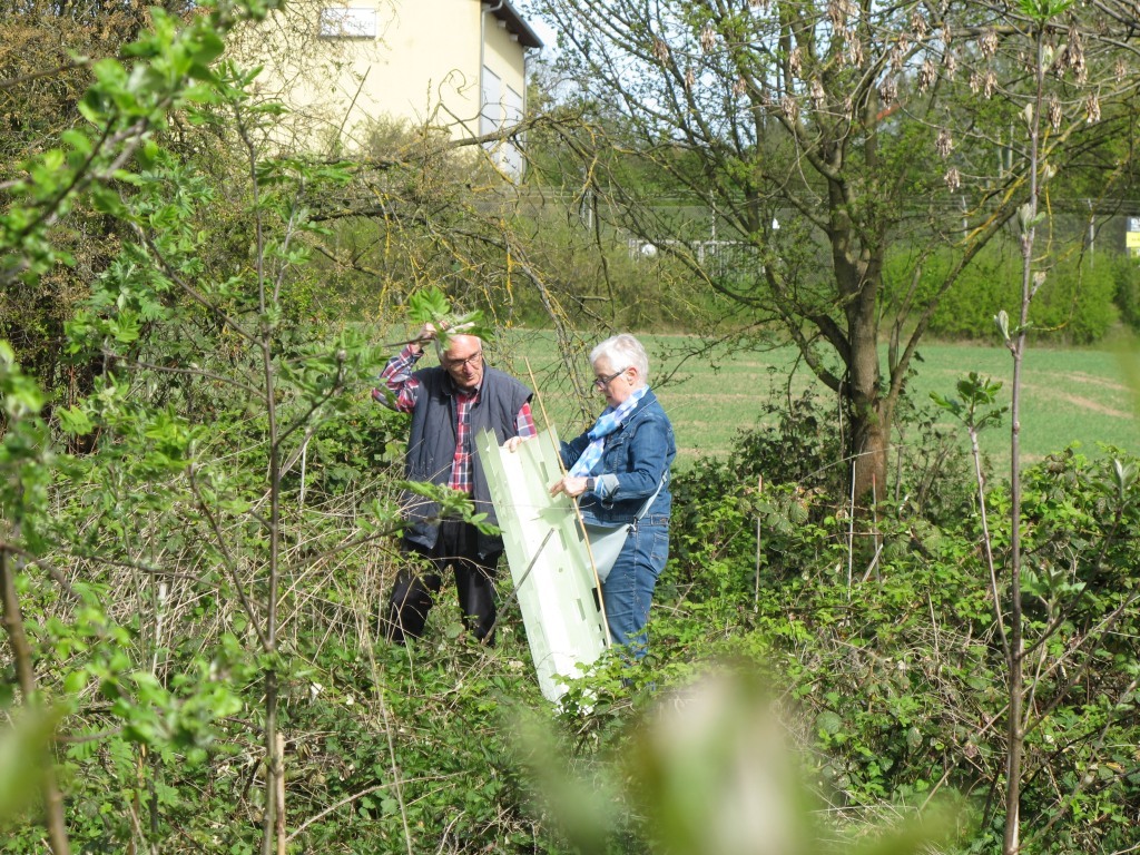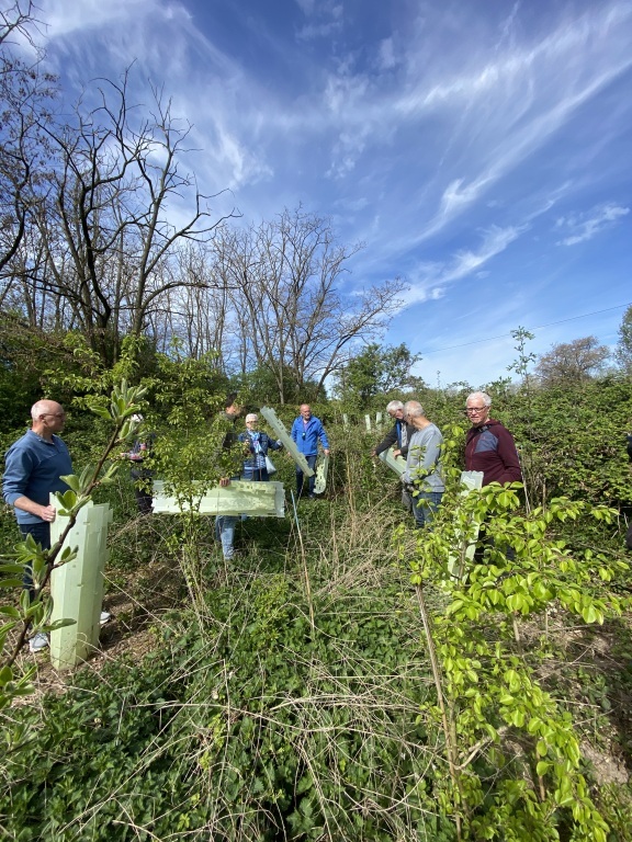 Nikolai Kalinke vom SDW war bei der jüngsten Brombeer-Rodungsaktion vor Ort. Er bedankte sich für unsere intensive Pflege und ist begeistert über sehr geringe Ausfälle. Eine Nachpflanzung sei nicht erforderlich. Wir haben auf sein Anraten die Pflanzhüllen geöffnet aber an den Bäumen belassen. Dies soll helfen, dass die Bäumchen mehr in die Breite wachsen. Einige wenige Bäume, die durch Brombeeren zu Boden gedrückt wurden, hat Heike Töngi aufgerichtet und mit Stangen befestigt. Bis Frühjahr 2026 soll der Bestand so belassen werden. Bis dahin werden vermutlich noch zwei Pflegeeinsätze unsererseits nötig.